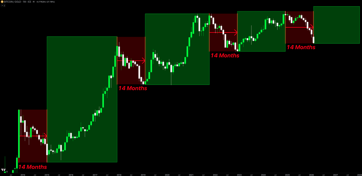Nhà phân tích Crypto Tice cho biết tỷ lệ Bitcoin so với Gold (BTC/Gold) đã bước vào khung 14 tháng suy yếu, giai đoạn từng xuất hiện trước các cú đảo chiều lớn trong các chu kỳ 2014, 2018 và 2022 – và nay lặp lại trong năm 2026.